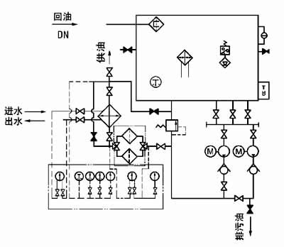油站出油口接有压力式电接点温度计,根据供油温度要求,调定最高和最低两个界限。在低温时,信号灯亮,人工开启加热器进行加热,当油温升至高点时,自动切断加热器,停止加热;供油口温度高时,报警并开冷却器。